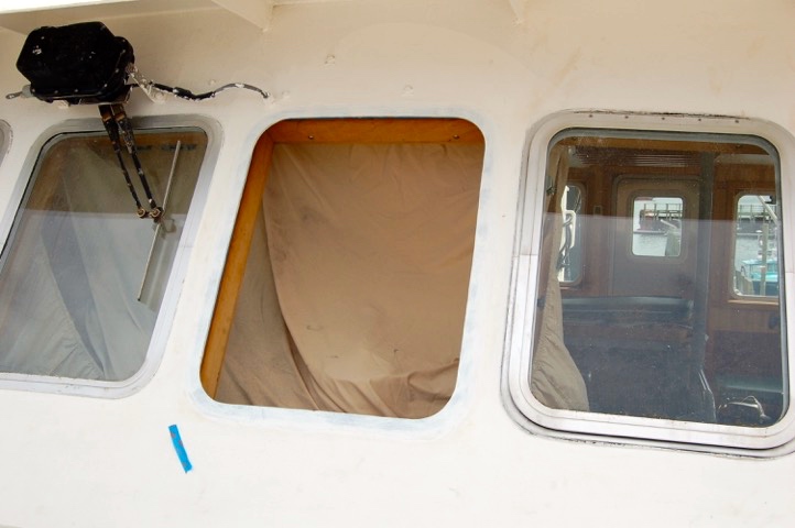 STONINGTON, ME — This is about the mid-way point for Sunbeam V dry dock. Take a look at the photos. The first photo shows one of several areas of rust under the flooring being repaired. The second is the replacement of the foggy pilot house window. The third is a random exterior shot. The fourth photo is the old leaking grey water tank being replaced. The fifth is Sunbeam V engineer Storey King’s dryer duct cleaning project — which was more extensive than expected. The final photo is the dismantled Sunbeam V hallway where the grey water tank is located.