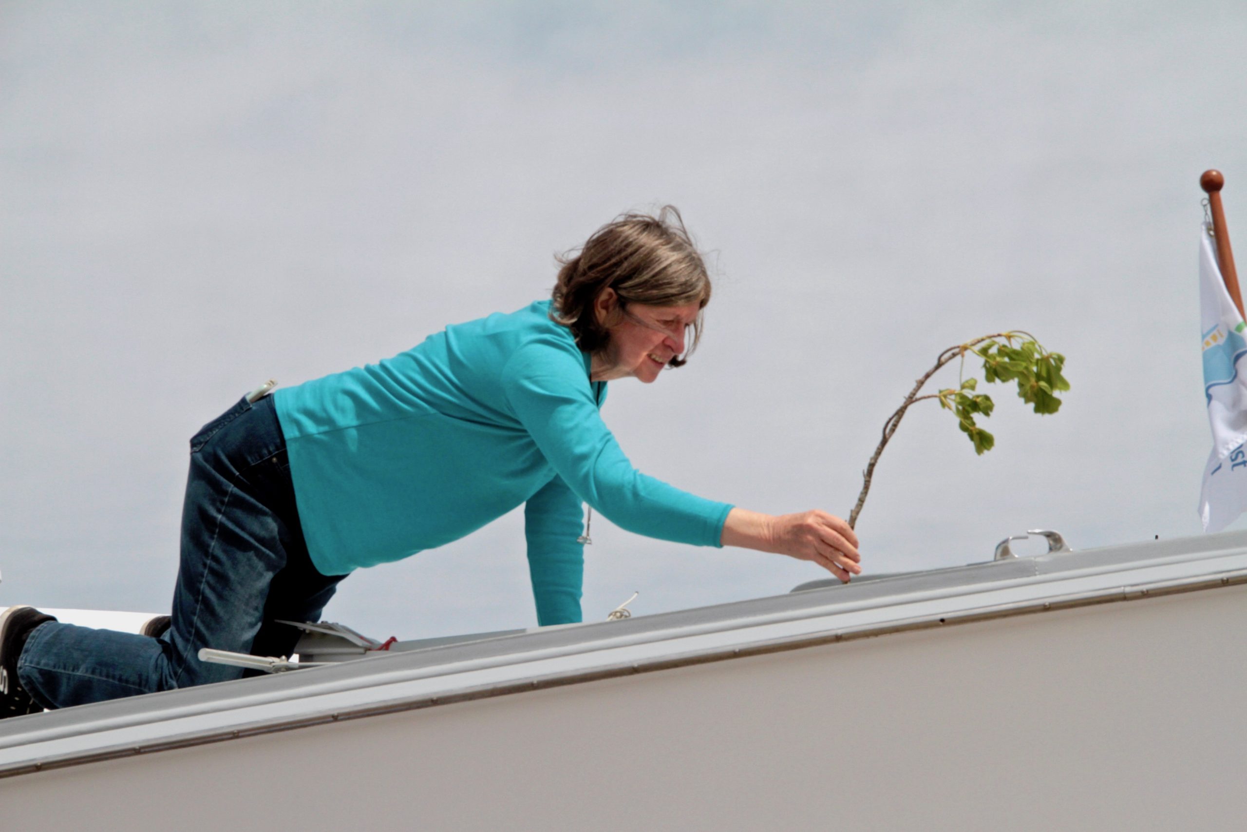 Thursday, May 23rd, Mission President John Zavodny opened the christening with welcoming remarks, then turned over christening proceedings to Island Outreach Director Cornman. Sharon Daley, the Mission’s Island Health Director placed a green-leaved branch on the boat bow symbolizing a safe return to harbor after each voyage.