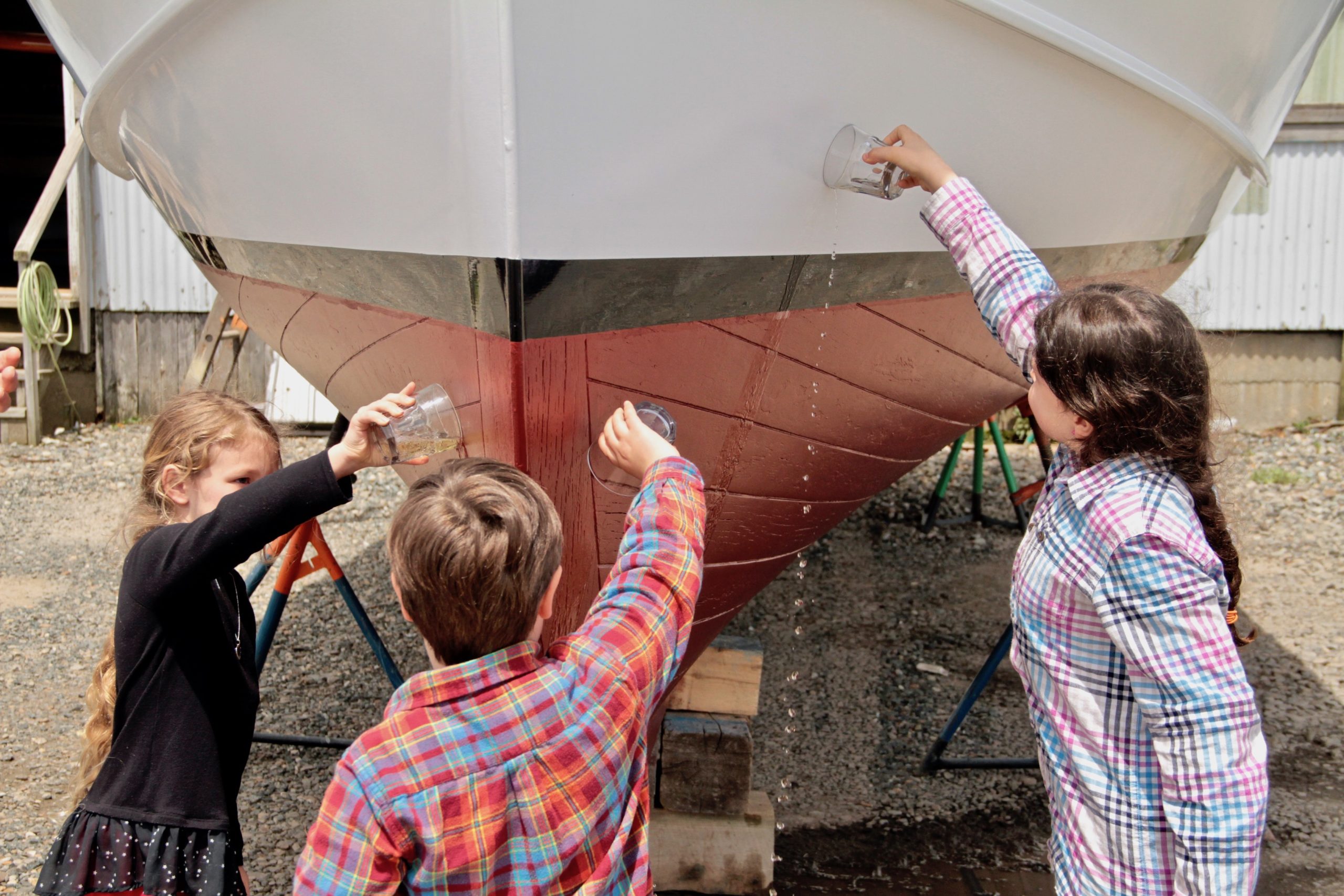 Then the three Isle au Haut students who helped choose the boat’s name, poured sparkling cider from four clear glasses over the bow while Moonbeam Captain Storey King said of the boat, “I christen thee, Moonbeam.”